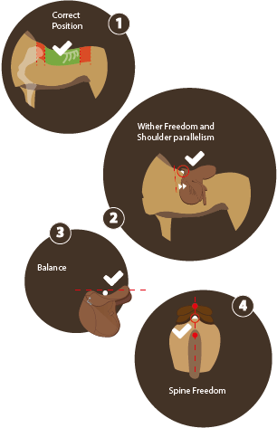 The panels (the underside of the saddle) should make even contact along the horse’s back, from front to rear. There should be no bridging (where the saddle lifts in the middle) or rocking (where it tips back and forth). Even contact ensures balanced weight distribution and prevents pressure points.